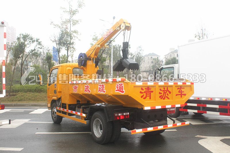 汽車(chē)底盤(pán)、淤泥箱、轉(zhuǎn)盤(pán)、抓吊裝置、連接組裝成整體,自卸式淤泥箱安裝汽車(chē)底盤(pán)上,在淤泥箱與駕駛室之間的汽車(chē)底盤(pán)上安裝轉(zhuǎn)盤(pán),抓吊裝置安裝于轉(zhuǎn)盤(pán)上,其中,所述的抓吊裝置包括有立柱、橫梁和抓斗,液壓伸縮式的立柱安裝轉(zhuǎn)盤(pán)上,液壓伸縮式的橫梁連接立柱,液壓伸縮式的活動(dòng)抓斗連接橫梁上。