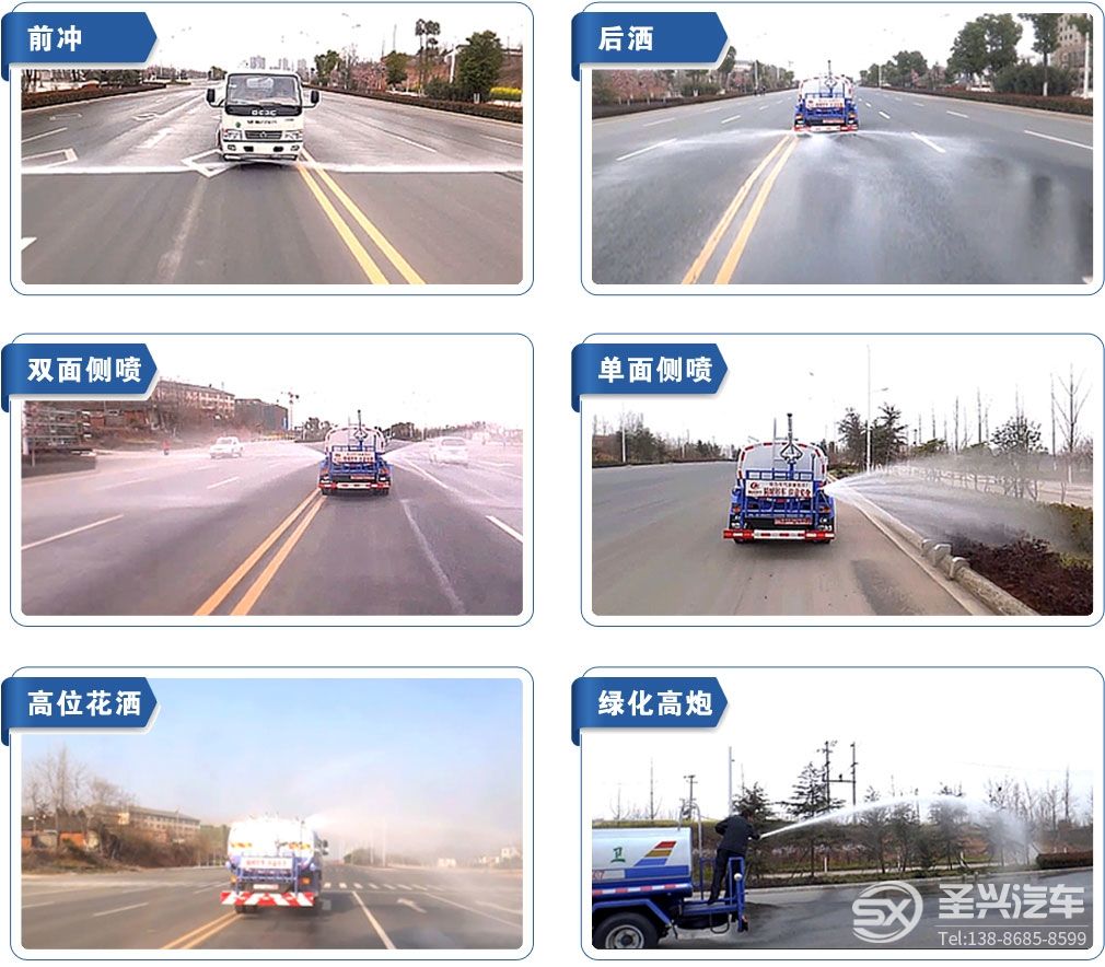 灑水車具有沖洗路面,澆灌園林,工地除塵,運(yùn)水、排水,應(yīng)急消防等功能。其標(biāo)配為前沖、后灑和側(cè)噴,采用自吸式專用水泵,泵可抽水排水,帶消防接頭、自流閥、罐體后帶工作平臺,安裝綠化灑水炮,炮可旋轉(zhuǎn)可調(diào)節(jié)水量大小(噴射呈柱、霧、毛毛雨)。?可加裝30米到60米霧炮,加裝護(hù)欄清洗刷,除雪鏟,自動電子水炮,打藥機(jī),保溫裝置等。