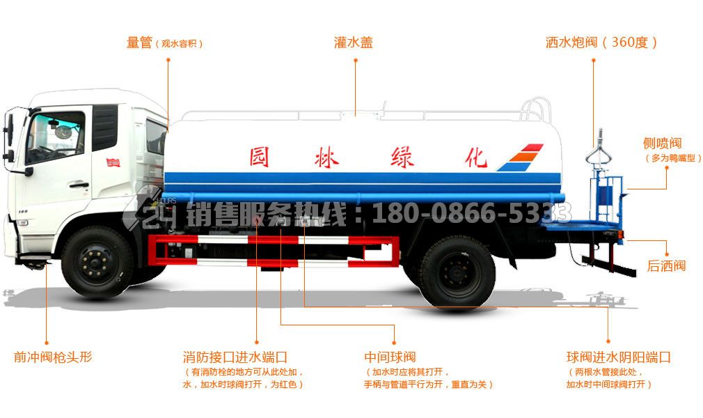 灑水車具有沖洗路面,澆灌園林,工地除塵,運水、排水,應(yīng)急消防等功能。其標配為前沖、后灑和側(cè)噴,采用自吸式專用水泵,泵可抽水排水,帶消防接頭、自流閥、罐體后帶工作平臺,安裝綠化灑水炮,炮可旋轉(zhuǎn)可調(diào)節(jié)水量大小(噴射呈柱、霧、毛毛雨)。?可加裝30米到60米霧炮,加裝護欄清洗刷,除雪鏟,自動電子水炮,打藥機,保溫裝置等。