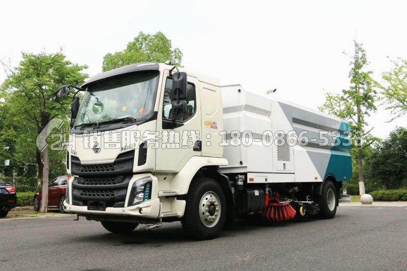 底盤通過加裝副發(fā)動機、風機、高壓水泵、清水箱、垃圾箱、左右立掃、帶噴水桿的寬吸嘴、低壓沖洗系統(tǒng)、掃盤降塵系統(tǒng)、液壓系統(tǒng)、專用裝置電控系統(tǒng)和副車架等改裝而成。