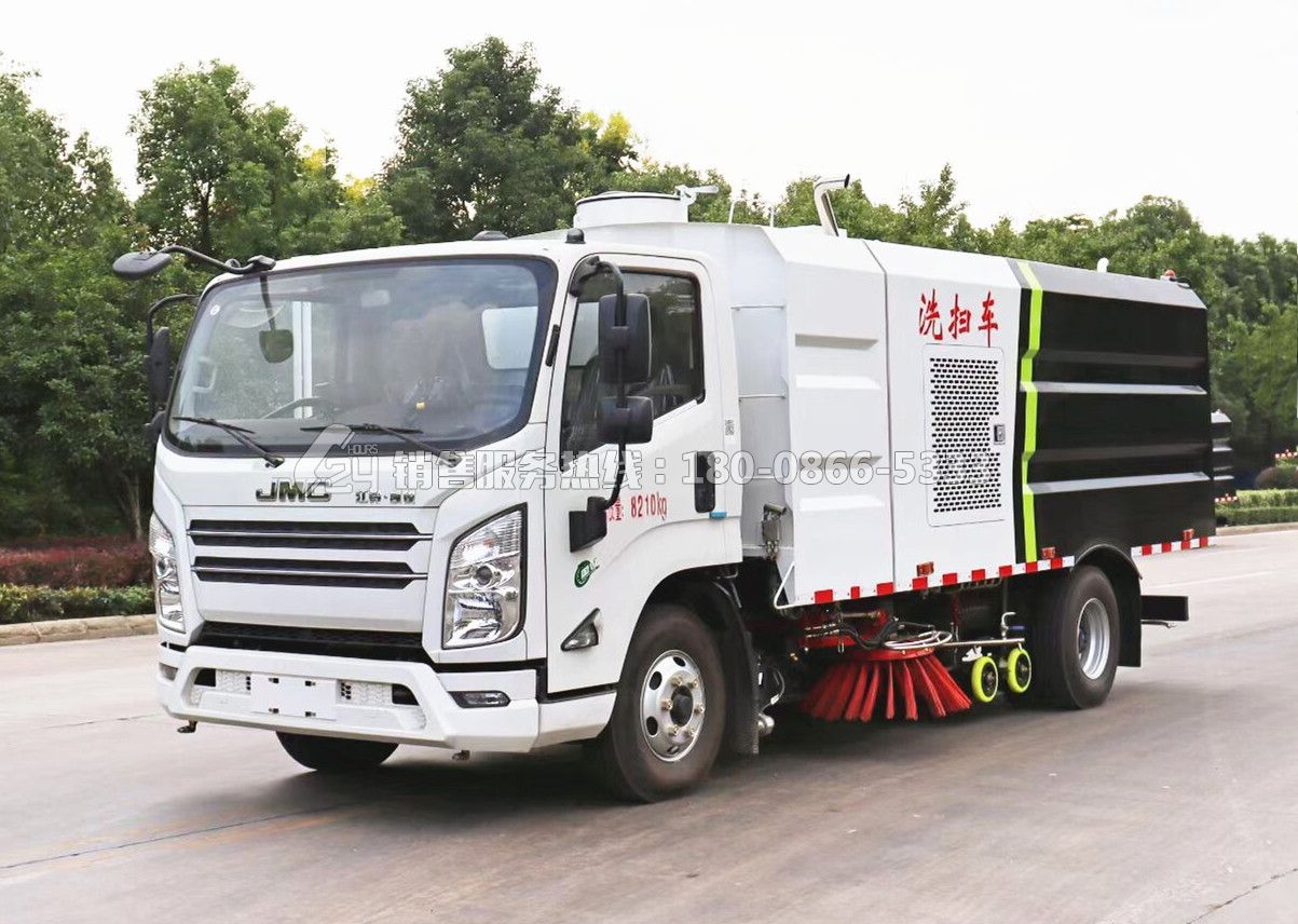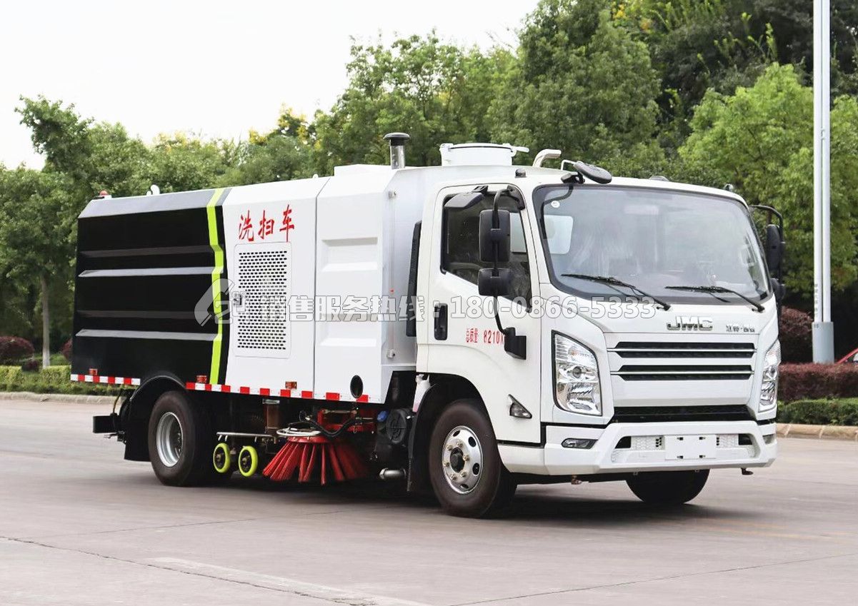 底盤通過加裝副發(fā)動機、風機、高壓水泵、清水箱、垃圾箱、左右立掃、帶噴水桿的寬吸嘴、低壓沖洗系統、掃盤降塵系統、液壓系統、專用裝置電控系統和副車架等改裝而成。