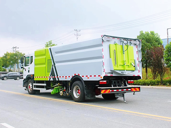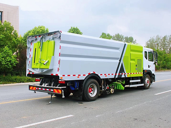 3、結(jié)構(gòu)先進:清水箱充分利用了車載空間,容積大。垃圾箱采用傾翻卸料,帶高液位報警保護裝置和自潔裝置。作業(yè)中垃圾箱內(nèi)污水液位達(dá)到規(guī)定高度時,保護系統(tǒng)會自動關(guān)停作業(yè)機構(gòu),可中途排水,排水后再作業(yè)直到垃圾箱裝滿垃圾。自潔裝置可在垃圾箱卸料時幫助卸料,清洗垃圾箱內(nèi)部。左右立掃為單掃盤,減少了掃刷數(shù)量和掃刷消耗量,能降低使用成本。左右立掃分開控制,可實現(xiàn)左掃、右掃和全掃等不同作業(yè)模式。寬吸嘴能方便調(diào)整和保證吸嘴與路面間的合理間隙。吸嘴內(nèi)高有噴水桿,盡可能多地將高壓洗滌噴嘴布置在吸嘴內(nèi)部,不但清洗效果好,還能最大限度減少高壓水氣流沖起污物產(chǎn)生的二次污染。左右噴水桿安裝在吸嘴上,隨吸嘴升降,結(jié)構(gòu)簡單緊湊,保證噴水桿的離地高度固定不變,達(dá)到最佳清洗效果。車子前端可加裝能左右上下擺動的高壓定點沖嘴,可對局部頑漬進行定點沖洗。開式液壓系統(tǒng)驅(qū)動左右立掃升降、左右掃肋旋轉(zhuǎn)、吸嘴升降、垃圾箱后門開閉、垃圾箱傾翻復(fù)位等機械動作。底盤變速箱側(cè)取力器驅(qū)動低壓水泵,實現(xiàn)灑水車的低壓沖洗功能。