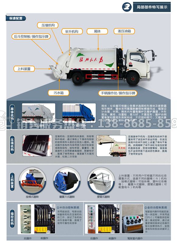 • 壓縮式垃圾車由密封式垃圾廂、液壓系統(tǒng)、操作系統(tǒng)組成。整車為全密封型,自行壓縮、自行傾倒、壓縮過程中的污水全部進入污水廂,較為徹底的解決了垃圾運輸過程中的二次污染的問題,避免了給人們帶來不便,關(guān)鍵部件采用進口部件,具有壓力大、密封性好、操作方便、安全等優(yōu)點。 可選配后掛桶翻轉(zhuǎn)機構(gòu)或垃圾斗翻轉(zhuǎn)機構(gòu)。