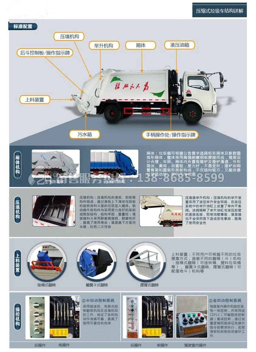 • 壓縮式垃圾車由密封式垃圾廂、液壓系統(tǒng)、操作系統(tǒng)組成。整車為全密封型,自行壓縮、自行傾倒、壓縮過(guò)程中的污水全部進(jìn)入污水廂,較為徹底的解決了垃圾運(yùn)輸過(guò)程中的二次污染的問(wèn)題,避免了給人們帶來(lái)不便,關(guān)鍵部件采用進(jìn)口部件,具有壓力大、密封性好、操作方便、安全等優(yōu)點(diǎn)。 可選配后掛桶翻轉(zhuǎn)機(jī)構(gòu)或垃圾斗翻轉(zhuǎn)機(jī)構(gòu)。