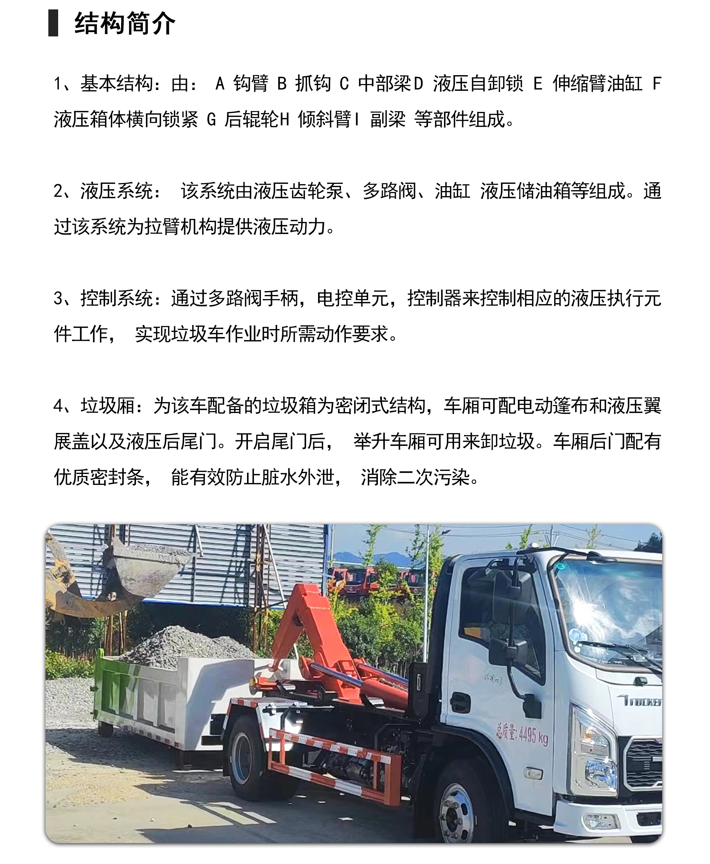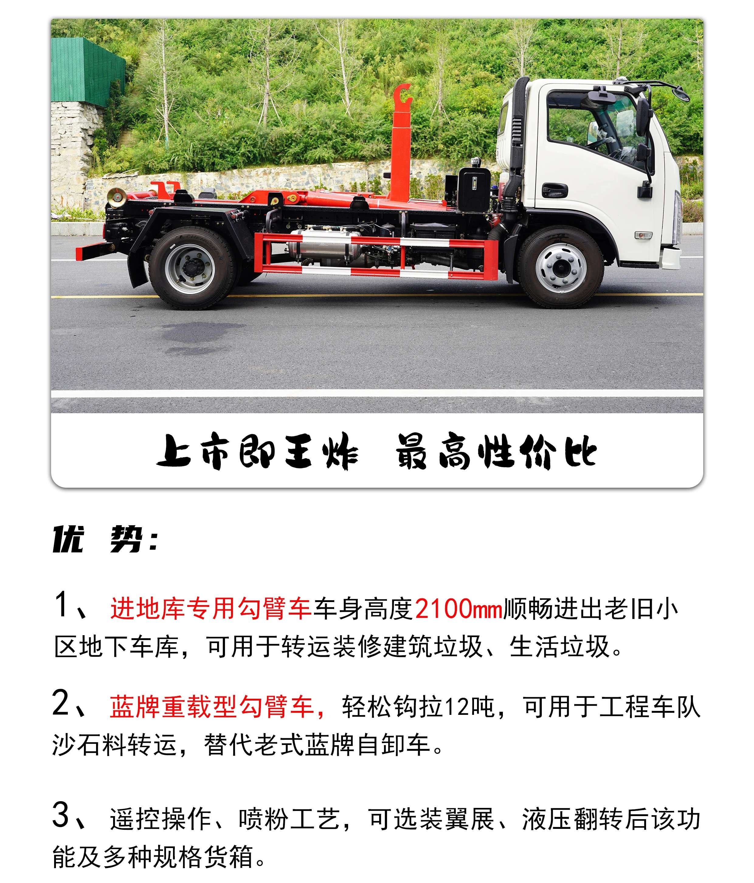 • 勾臂式垃圾車又稱為車廂可卸式垃圾車。主要適用于市政環(huán)衛(wèi)、物業(yè)管理、大型廠、工礦等各種場(chǎng)所收集、運(yùn)載各種垃圾。 勾臂垃圾車特點(diǎn):鉤臂垃圾車采用高新設(shè)計(jì)可擺得鉤臂,一車可帶多個(gè)大廂,裝卸方便,實(shí)現(xiàn)車廂的二次吊裝并使機(jī)構(gòu)最為省力,具有結(jié)構(gòu)簡單,操作穩(wěn)定方便,高效率裝卸,節(jié)省人力等優(yōu)點(diǎn)。鉤臂垃圾車可根基用戶要求配備若干個(gè)垃圾轉(zhuǎn)運(yùn)箱。轉(zhuǎn)運(yùn)箱可作為一個(gè)簡易、美觀、環(huán)保的垃圾轉(zhuǎn)運(yùn)站,最大限度提高了車輛的使用效率。