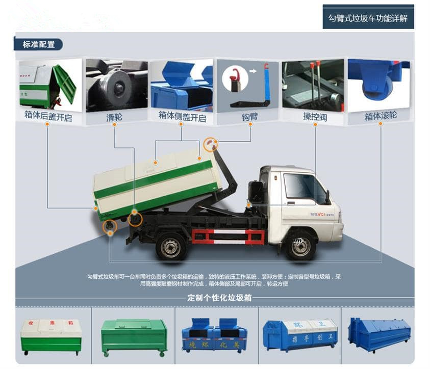 勾臂采用高強(qiáng)度優(yōu)質(zhì)錳鋼,由液壓系統(tǒng)、操作系統(tǒng)、拉臂,組成。舉升油制缸為國(guó)內(nèi)液壓件廠家生產(chǎn)的雙作用油缸,多路閥液壓控制,操作員手動(dòng)控制垃圾廂吊上放下,帶自卸功能,上下一次工作循環(huán)時(shí)間≤40S。標(biāo)配帶液壓油箱,滑輪,液壓多路閥,拉臂油缸,鎖緊油缸,液壓油過濾器,液壓油泵,液壓表等部件組成。選配可增配液壓支腿。