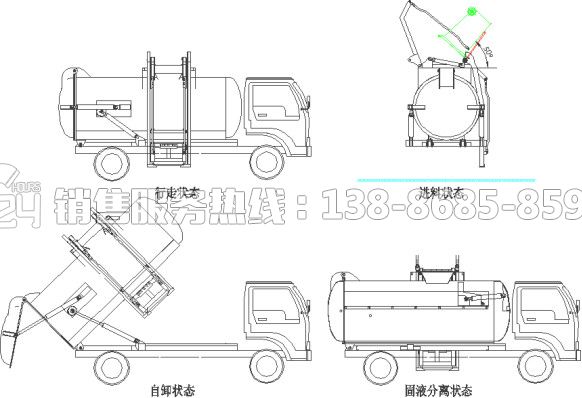 3.罐體右側(cè)前部裝有掛桶提升機(jī)構(gòu)裝卸桶裝垃圾,掛桶提升機(jī)前側(cè)裝有圓形液位計(jì)。