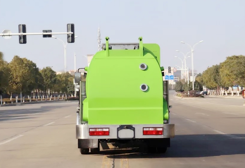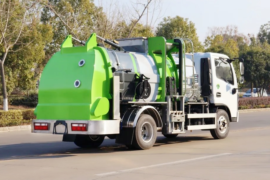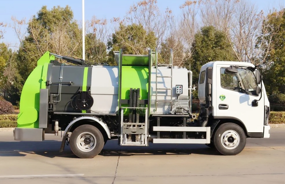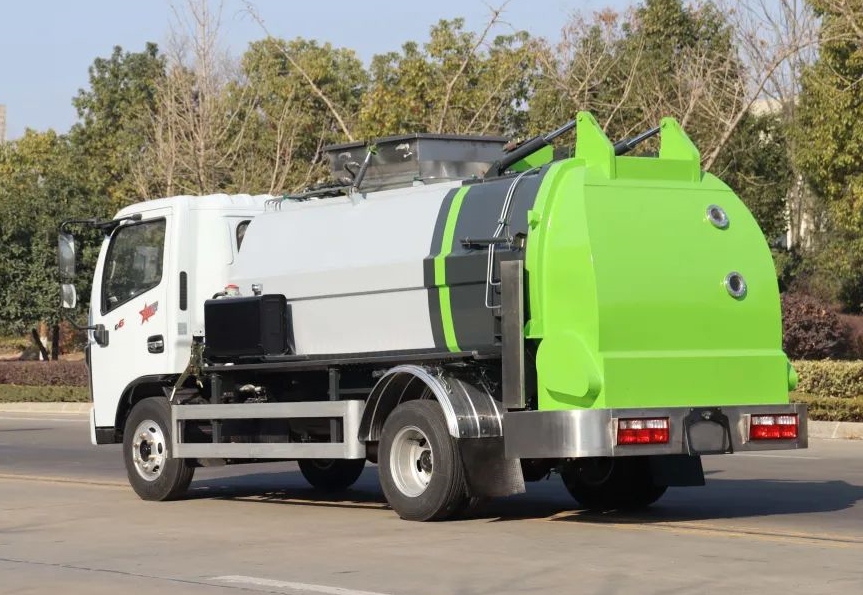 餐廚垃圾車采用方形箱體結(jié)構(gòu),箱體容積6立方。箱體采用不銹鋼材質(zhì),帶推鏟卸料功能(不帶舉升),不銹鋼干濕分離過濾網(wǎng),液壓開啟/關(guān)閉后蓋,后蓋帶密封條、液壓鎖緊;雙鏈條式提升機(jī),可掛國標(biāo)120/240L標(biāo)準(zhǔn)塑料垃圾桶;駕駛室內(nèi)集中電控(提升機(jī)外部手動控制),可加裝高壓清洗功能(液壓馬達(dá),清洗泵,自動回位卷盤,高壓清洗水槍)帶夜間作業(yè)照明燈。