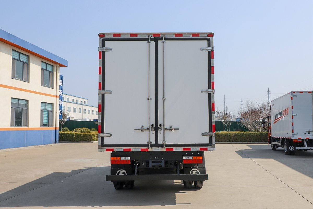 選裝配置底板加裝通風(fēng)槽,龍骨架加固,頂部鋁合金導(dǎo)軌,不銹鋼肉鉤,廂內(nèi)貨架,保溫門簾等