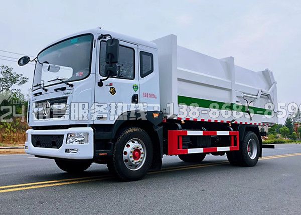 該款展示的是國六東風多利卡D9對接式垃圾車,采用東風多利卡D9駕駛室,國六康明斯210馬力或者玉柴200馬力,選裝3950/4500軸距,東風DT0690變速箱,3.9噸/8噸前后橋,4.5噸/10噸德納車橋,250雙層大梁,295/80R22.5真空輪胎。該箱體采用的全密封式,后箱蓋采用的是液壓鎖緊,有效容積為14-17立方米。