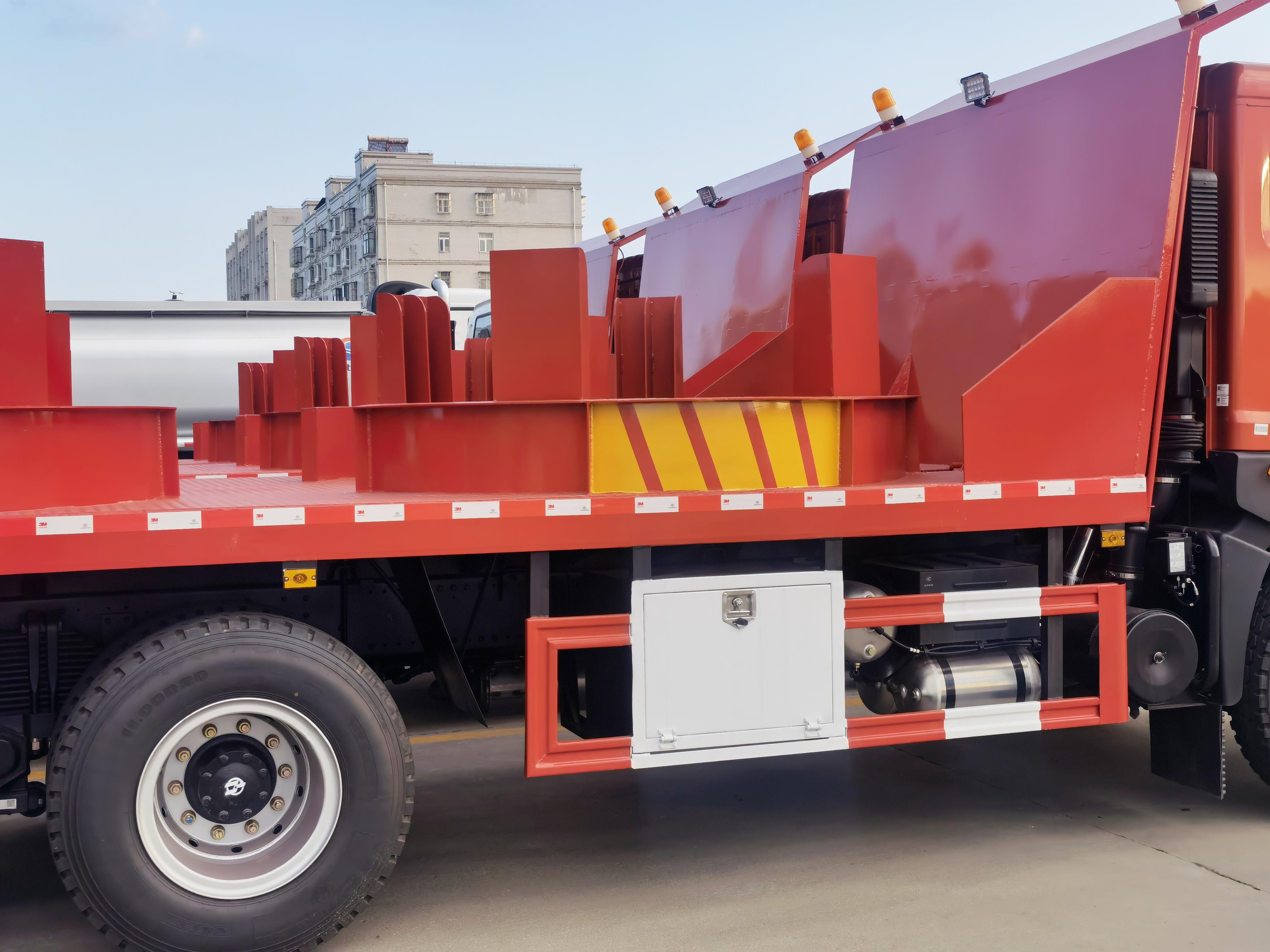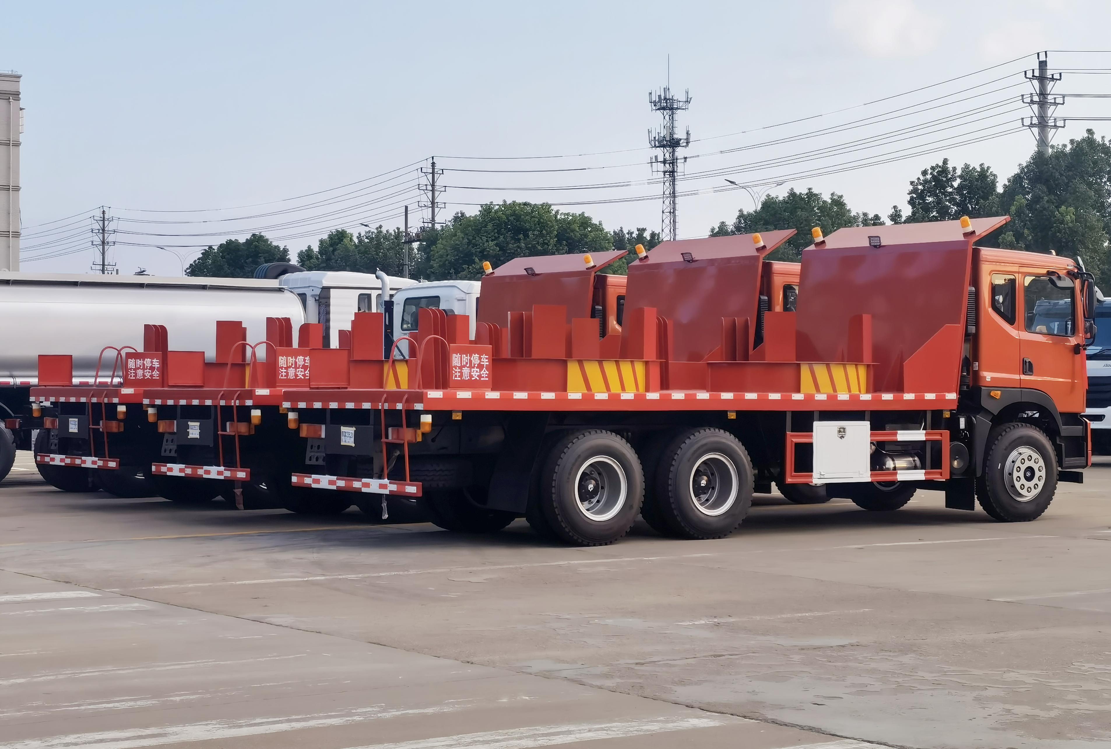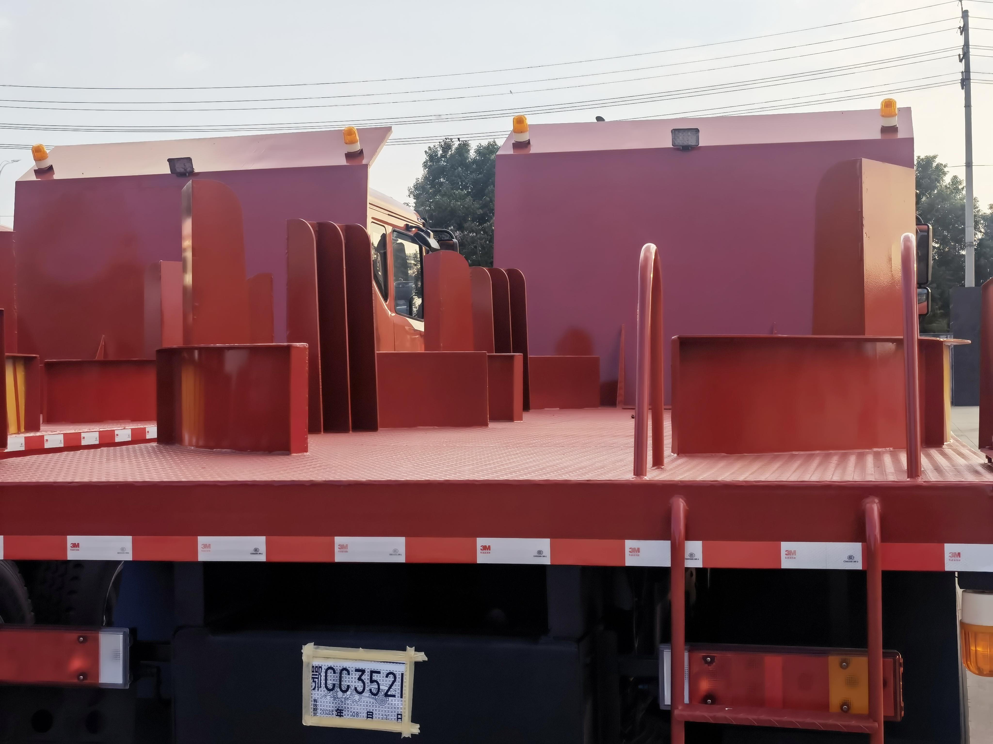 該車采用東風華神T5環(huán)衛(wèi)專用底盤,玉柴270馬力國六發(fā)動機,法士特8檔變速箱,4350+1350mm軸距,280局雙,前后橋5T/10T*2,11.00R20鋼絲胎,空調(diào),氣囊座椅,多功能方向盤,電動門窗,中控,遙控,MP5,遮陽罩,LED日行燈,行車記錄儀。電瓶及油箱頂部均帶防護罩帶隔熱功能,底板帶抬包部分前、后板為Q235花紋板(起防滑作用),中間及四個掛鉤支撐點為14mm板,底板帶50MM厚巖棉隔熱層,四個掛鉤,承重部分用槽鋼構(gòu)架,貼反光條,抬包圈做活動的用螺絲固定方便拆卸、移動,該車前部帶裝沙槽,后部帶警示牌,車輛左右各一個爆閃警示燈。