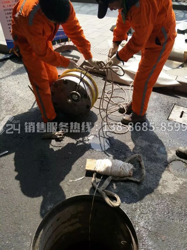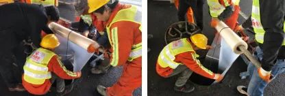 2、拉入內(nèi)襯軟管:將滑輪放置到適當(dāng)?shù)奈恢茫o接著把碾壓好、預(yù)切好長度的內(nèi)襯軟管從檢查井處拉進要修補的管道內(nèi),并在管兩端安裝扎頭。