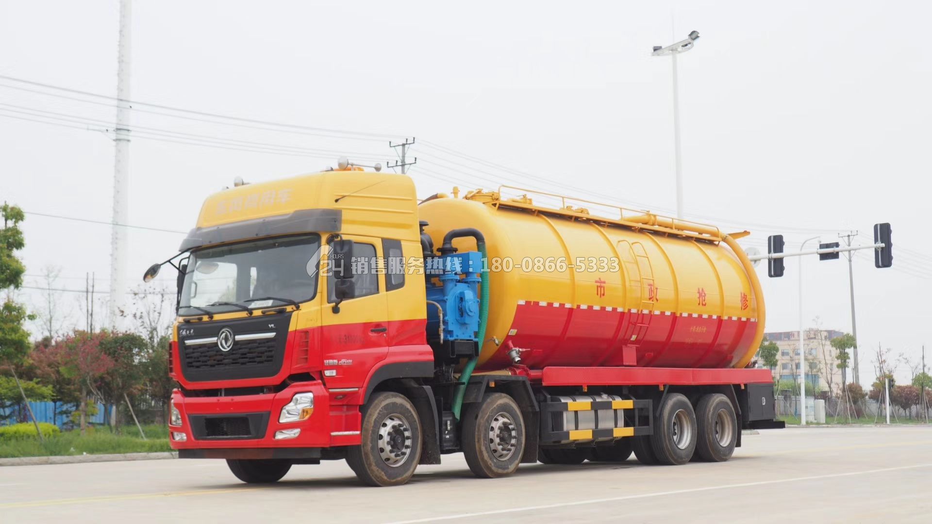 東風(fēng)天龍前四后八清洗吸污車 前四后八吸污車上裝配置:罐體采用8mm碳鋼制作,罐體有效容積為34.0立方(罐體尺寸為直線段7100*2350,其中清水罐長(zhǎng)2600,污水罐長(zhǎng)4500),外部采用4根63號(hào)槽鋼為加強(qiáng)筋,水罐約10立方,吸污罐約24.0立方。直焊縫,不接。100升副油箱,中置雙頂,315流量天津通潔高壓清洗泵,10個(gè)噴頭,60米高壓管,后封頭后蓋為小蓋用液壓開(kāi)啟直徑600,小蓋加裝可固定螺帽,小蓋旁兩個(gè)自留閥120mm,操作箱為卷閘門封閉式,帶兩個(gè)視糞窗,洗手裝置,洗污管一根。山東濰柴420馬力發(fā)動(dòng)機(jī),SK-42山東濰坊水循環(huán)真空泵,防溢流閥門。