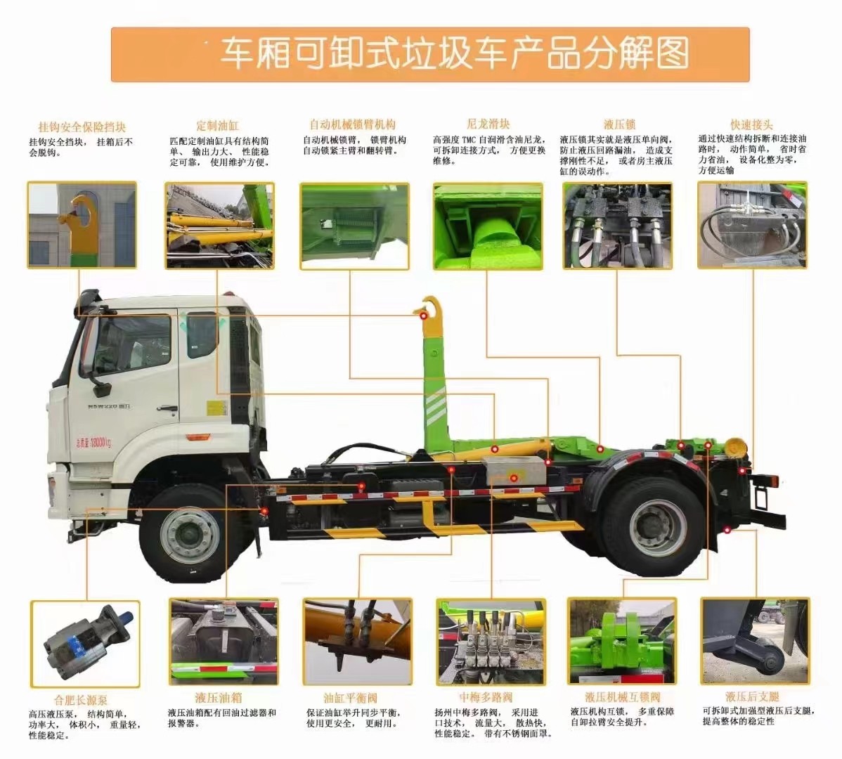 上裝配置:起重能力12-20方移動(dòng)垃圾箱站,手電一體,橫向鎖緊,液壓支腿,國(guó)產(chǎn)精品油缸,中梅多路閥,高強(qiáng)度合金鋼一體式主勾臂,加強(qiáng)型副梁,鑄鋼尾托輪,液壓完成上箱+下箱+鎖緊+自卸作業(yè)等,實(shí)現(xiàn)一車配多箱/多站的循環(huán)轉(zhuǎn)運(yùn)。