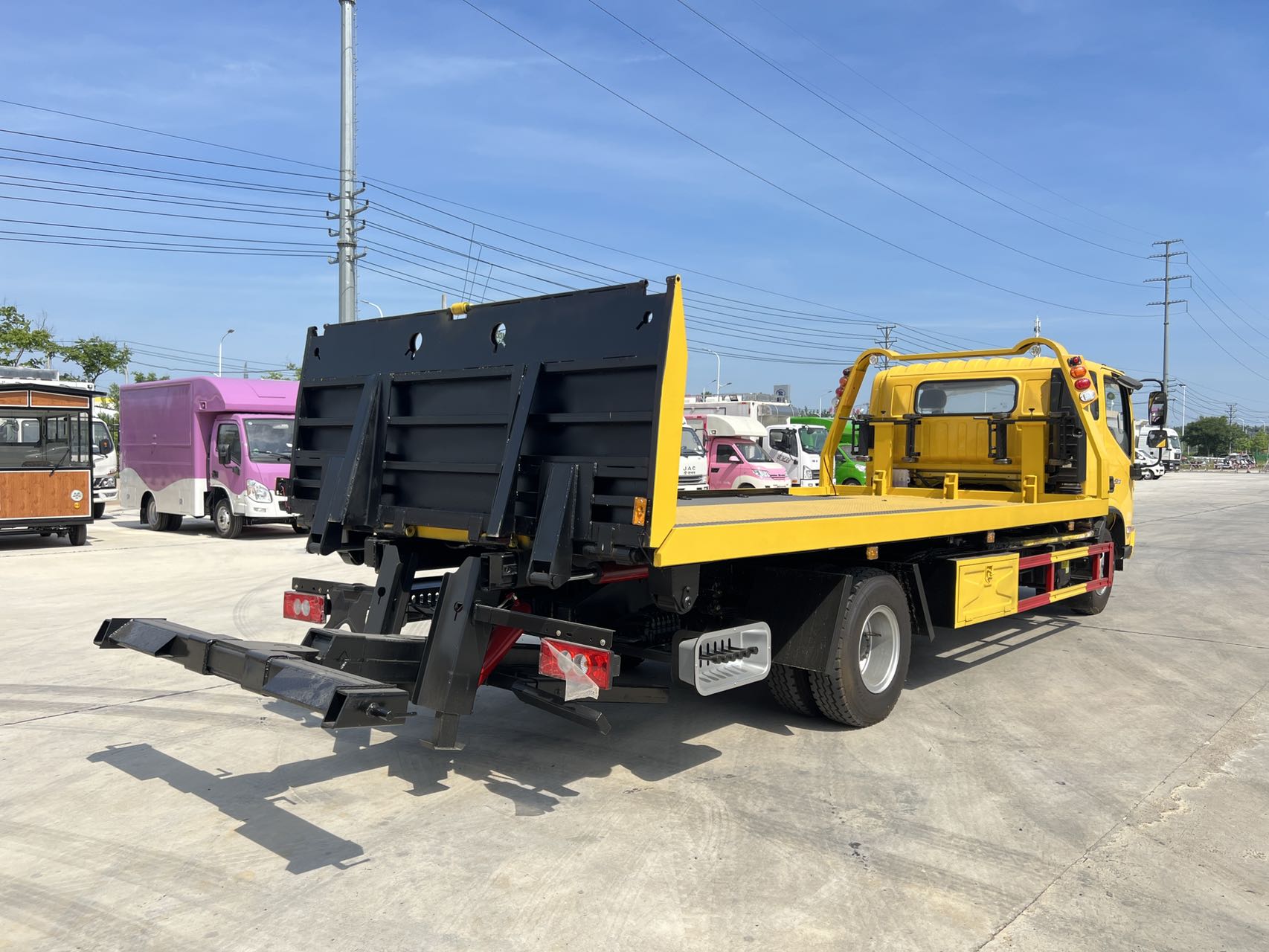 3.傾斜油缸布置于大梁內(nèi)側(cè)并支撐在同一橫梁上,載荷分布均勻,大大提高整車的使用壽命:可更換式摩擦片,后著地助滾輪,板面滑動(dòng)更順暢,保養(yǎng)輕松成本低。可調(diào)節(jié)式機(jī)械限位裝置,讓平板鎖定更精準(zhǔn)、更可靠、更安全;板面底梁和折疊鉸鏈橫梁強(qiáng)化處理,承載能力進(jìn)一步提升;多種捆綁工具,使用簡易,作業(yè)更輕松。