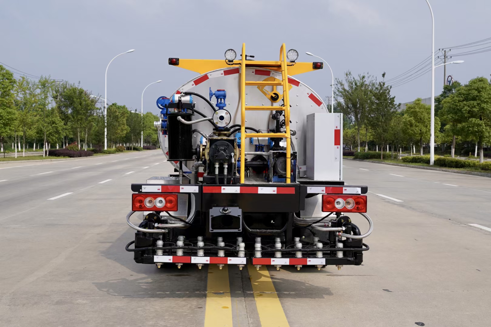 4 、瀝青的灑布控制不僅可以在駕駛室內(nèi)完成,也可以在車尾的操作平臺(tái)上進(jìn)行控制;