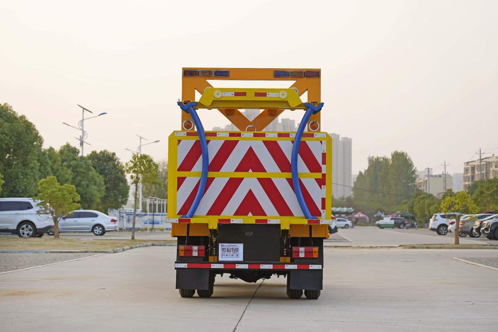 上裝采用Q235國標(biāo)邊3mm底板花紋板4mm厚,箱體后部防撞緩沖模塊包采用國際知名技術(shù)產(chǎn)品70K防撞緩沖模塊,防撞緩沖吸能模塊主要由車載防撞緩沖墊和導(dǎo)向標(biāo)志架組成,可充當(dāng)施工作業(yè)車輛后方的緩沖衛(wèi)士。