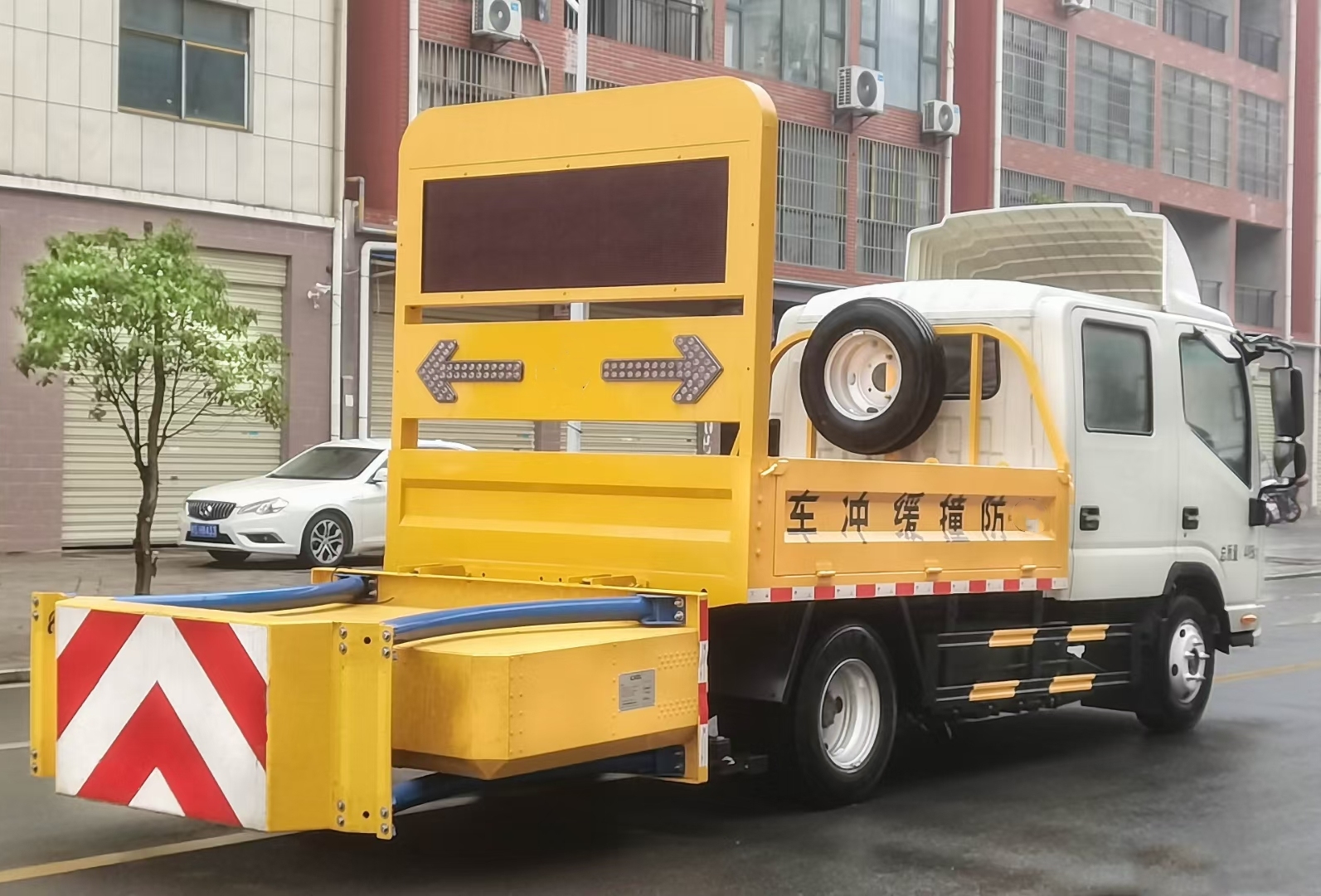 上裝采用Q235國標邊3mm底板花紋板4mm厚,箱體后部防撞緩沖模塊包采用國際知名技術產品70K防撞緩沖模塊,防撞緩沖吸能模塊主要由車載防撞緩沖墊和導向標志架組成,可充當施工作業(yè)車輛后方的緩沖衛(wèi)士。