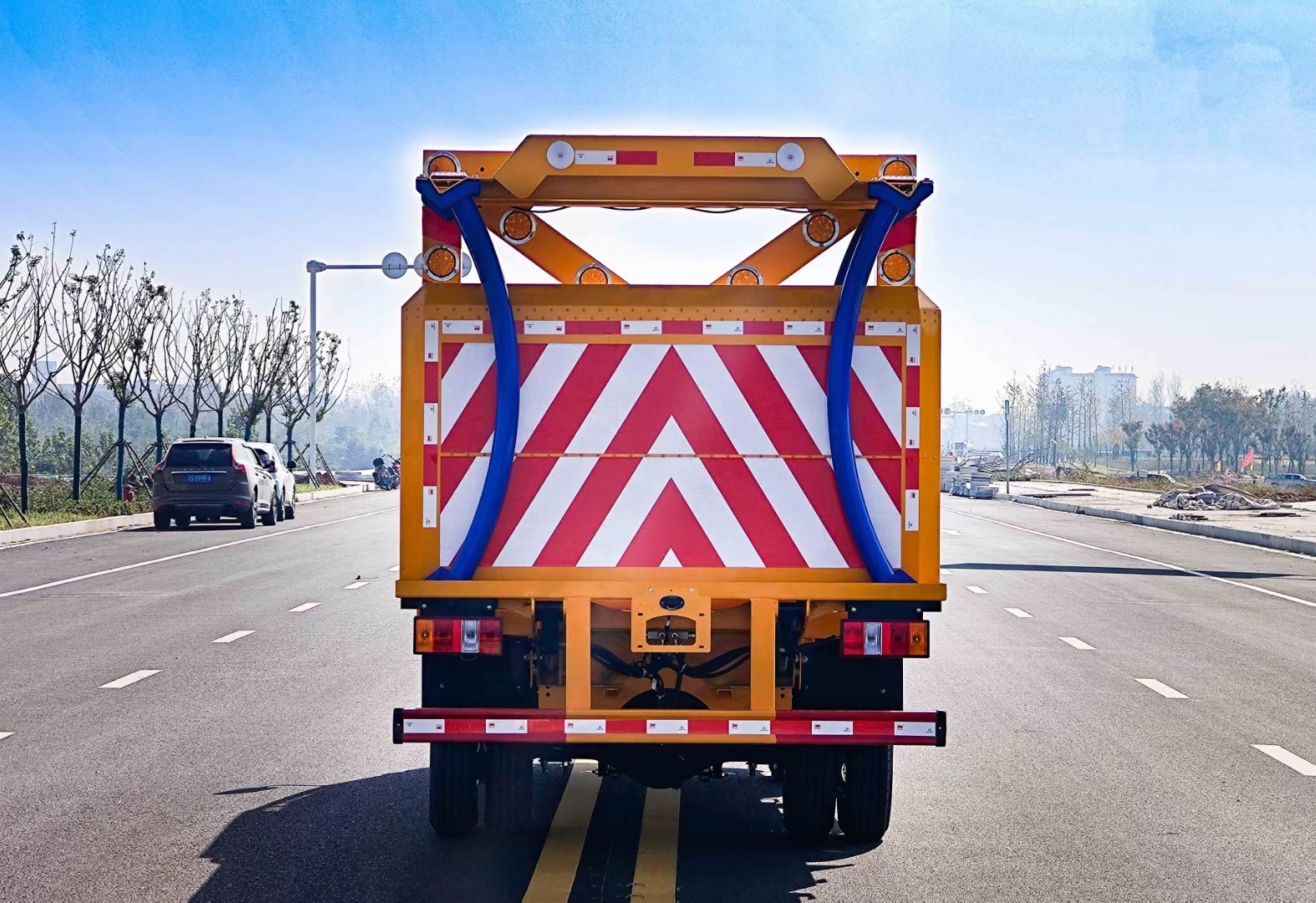 上裝采用Q235國標邊3mm底板花紋板4mm厚,箱體后部防撞緩沖模塊包采用國際知名技術產(chǎn)品70K防撞緩沖模塊,防撞緩沖吸能模塊主要由車載防撞緩沖墊和導向標志架組成,可充當施工作業(yè)車輛后方的緩沖衛(wèi)士。