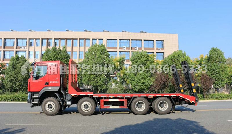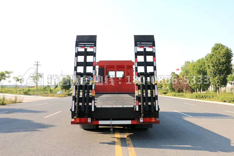 東風(fēng)柳汽乘龍H5型前四后八平板運輸車板長7.2米,斜坡長0.6米,8mm厚防滑花紋板,帶雙簧爬梯,簡易支腿,橫梁間距350mm,橫梁規(guī)格120x120x8(mm),實際可承載35.0噸,再加300雙層大梁可運輸15-25噸挖掘機,裝載機,收割機等機械。