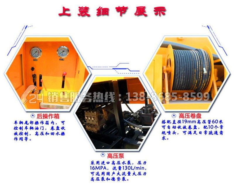 清洗部分:清洗罐采用8mm武鋼碳鋼制作,容積3.5方,帶視水管,安裝天津通潔/雙耀/品孚250L高壓清洗泵,壓力為16-22Mpa,流量:124L/min--315L/min,帶60米清洗軟管,卷管力為1800N,膠管內(nèi)徑22mm,卷管速度0-25m/min,推進(jìn)力度大于180N。