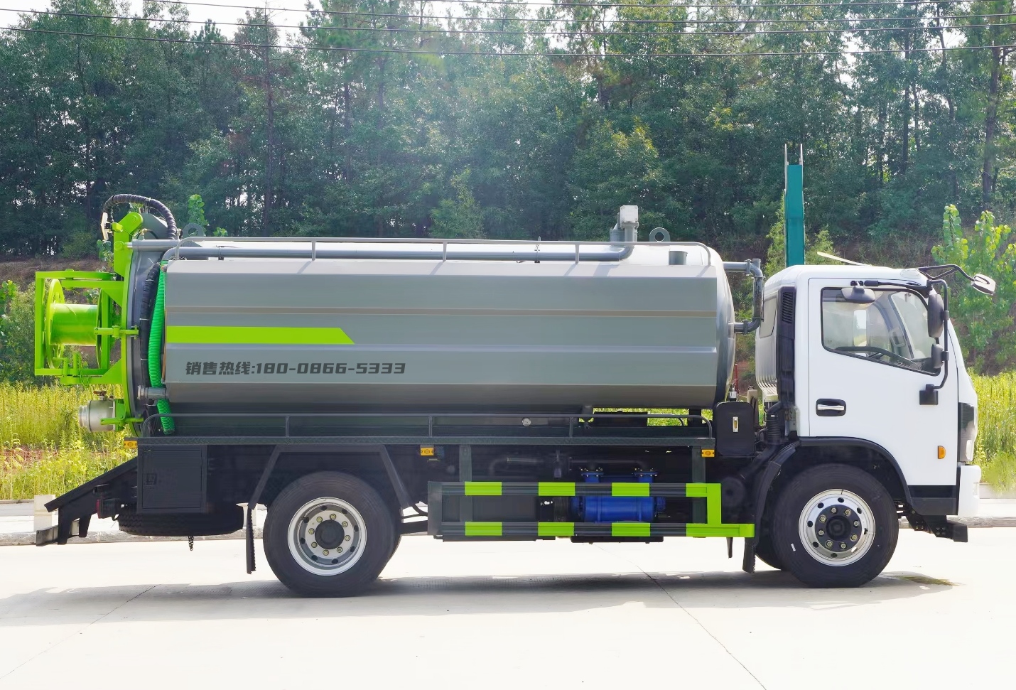 清洗部分:清洗罐采用4mm武鋼碳鋼制作,容積3.0方,帶視水管,安裝通潔/雙耀/品孚215L高壓清洗泵,壓力為20-22Mpa,流量:124L/min--315L/min,雙進(jìn)水口帶過濾裝置,尾部加大液壓卷盤,帶60米清洗軟管,卷管力為1800N,膠管內(nèi)徑22mm,卷管速度0-25m/min,左右兩邊65消防進(jìn)水口,50低位排水口,洗手裝置,氣吹水功能,卷盤清洗裝置,兩邊工具箱,兩倉互通。