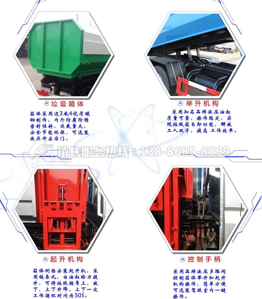時(shí)風(fēng)3方自裝卸式垃圾車(chē),箱體采用優(yōu)質(zhì)容積板制作,邊板厚度2mm,底板厚度3mm,掛桶提升機(jī)置于副架一側(cè),采用液壓驅(qū)動(dòng),提升機(jī)類型需根據(jù)客戶實(shí)際用車(chē)需求進(jìn)行確定,液壓閥采用國(guó)內(nèi)知名品牌,穩(wěn)定性好,液壓傳動(dòng)效率高,垃圾箱支持舉升自卸,后門(mén)開(kāi)閉采用手動(dòng)開(kāi)閉,結(jié)構(gòu)簡(jiǎn)單,經(jīng)久耐用。