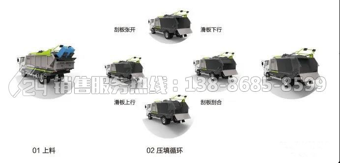 2)、動態(tài)壓填作業(yè)間隙恒定控制技術(shù),始終保持壓填機(jī)構(gòu)與垃圾箱敞口的間隙恒定,防止垃圾飄灑。