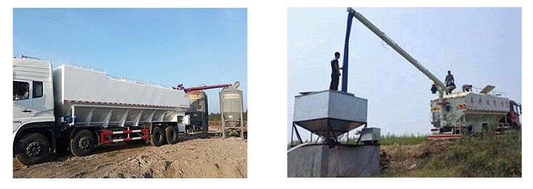 • 散裝飼料運(yùn)輸車主要用于從飼料廠向畜牧場養(yǎng)禽場及飼料加工用戶運(yùn)輸散裝飼料成品或飼料生產(chǎn)原糧,同時(shí)它也可用來運(yùn)輸某些無腐蝕性粉粒狀原料,如制藥廠粉料和糧庫周轉(zhuǎn)。散裝飼料車的飼料罐架設(shè)在卡車的底盤上,罐頂開有進(jìn)料口 頂部的一根螺旋輸送卸料管則可自由回轉(zhuǎn)和抬升,抬升的仰角可達(dá)60度。運(yùn)輸時(shí),頂部的螺旋管平臥在罐頂;卸料時(shí)則抬起,使管端的出料口與畜禽飼養(yǎng)場貯料罐頂部的進(jìn)料門相接,駕駛室內(nèi)裝有操縱裝置,卸料時(shí)通過車底的動力輸出軸和減速器來驅(qū)動螺旋,以完成卸料。