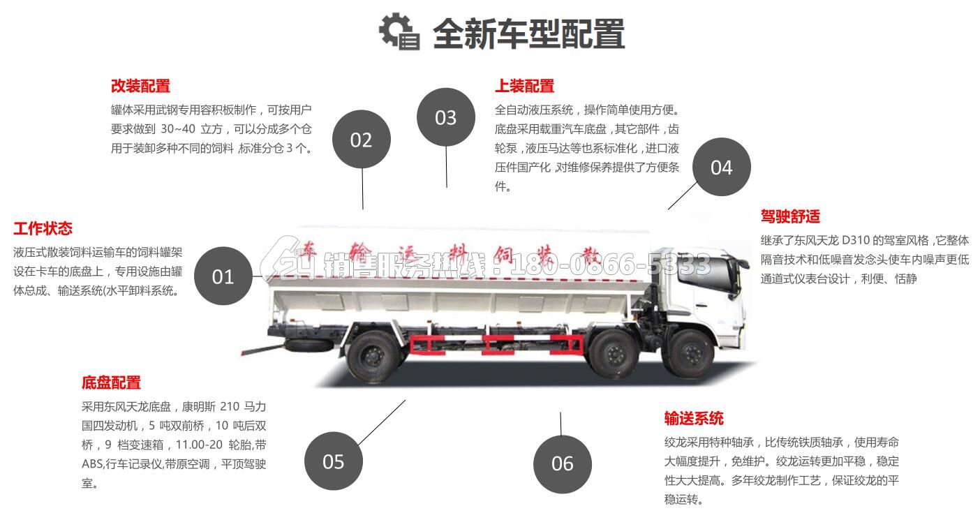 東風天錦散裝飼料車,東風天錦單排駕駛室,康明斯180馬力或210馬力,法士特8檔變速箱,5000mm軸距,10.00R20鋼絲胎,電動門窗,中控鎖,ABS,方向助力,原裝空調(diào)