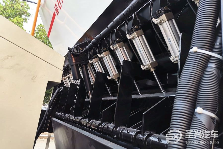 料倉內安裝有內影藏式中置頂翻轉軸采用通軸保證料倉升起的平穩(wěn)性;料門為16路控制,采用了角度螺旋角度控制儀,要使料門達到某個開度,可在角度控制儀上設置料門打開角度,非常方便,準確。有效調整撒布均勻度,改變了傳統(tǒng)石料撒布不均的情況;分料板和下料板的調節(jié)范圍大,適用不同規(guī)格(S3~S24mm)的石料。